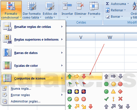 El formato de números en excel es utilizado para cambiar la apariencia de los números que se muestran como valores de las celdas... Todas las operaciones se pueden hacer a partir de estos menús. Haz click en la función "iconos".. Presione con el botón izquierdo del mouse activado o coloque el puntero del mouse sobre conjuntos de iconos.