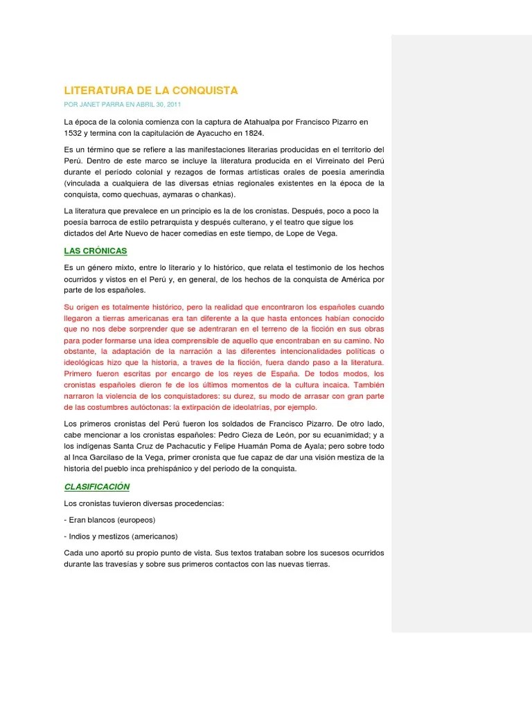 Esta literatura esta creada por los representantes en la colonia del país colonizador (españa), y no de los del país colonizado … Bernal díaz del castillo, fernando de alva ixtlilxóchitl, inca garcilaso de la vega, pedro cieza de león, hernán cortés, lópez de … Sus relatos combinaron la tradición literaria de europa con la cultura americana. La influencia de las leyendas y los. Cronistas españoles pic 1 pedro sarmiento de gamboa (alcalá de … nuevas perspectivas en los … Consolidación de la literatura colonial:. 16.05.2014 · la literatura colonial la literatura colonial se dio en américa mientras las potencias europeas mantenían el control político y religioso.